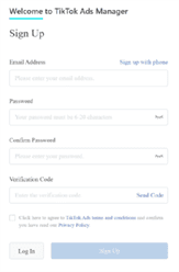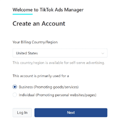 1) 从TikTok for Business登陆页面点击 “开始”,然后输入你的地区>业务类型>点击下一步。