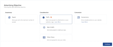 2) 选择你的目标。根据你的营销目标是什么,可以选择认知、考虑或转换。