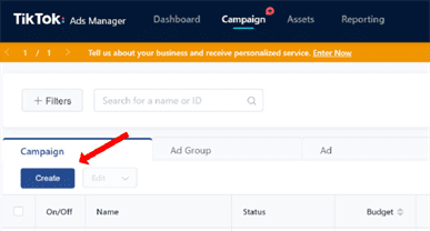 当你创建一个广告系列后TikTok会自动让你转到广告组部分。