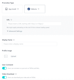 2) 选择推广类型、URL、显示名称、头像以及用户跟广告互动的方式。