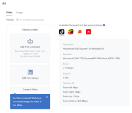1)上传视频或图片素材。TikTok可以把静止的图片变成视频,但一定要遵循TikTok的广告规定,例如像素,时长都有规定。